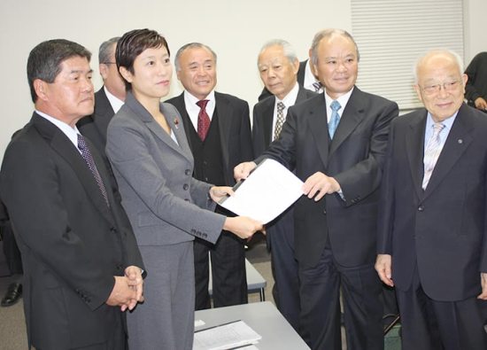 > > 舟山康江参院議員と党大阪府連の松井博史8区総支部長、宮地和夫豊中市議、